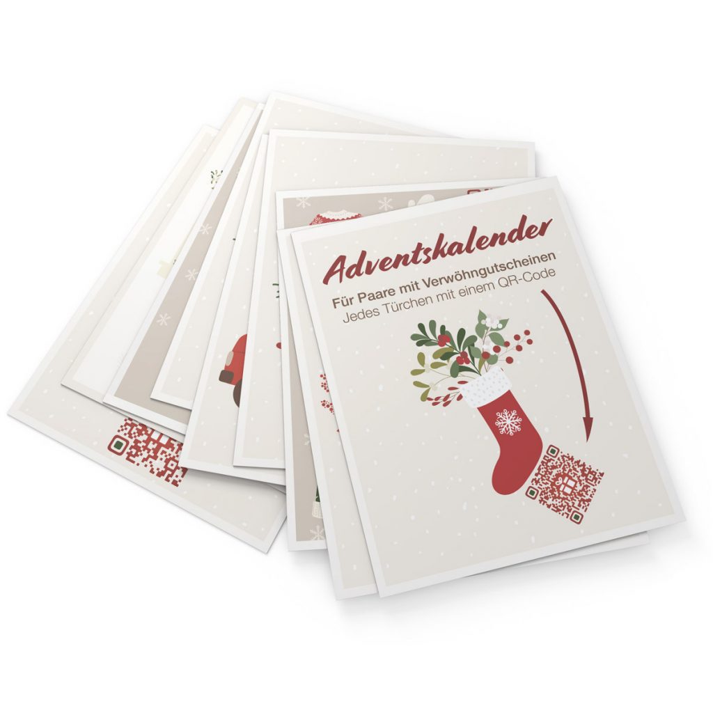 Unser Bestseller – ein Adventskalender mit Verwöhngutscheinen für Paare. Hinter jedem Türchen (QR Code) entdeckt Ihr eine Überraschung.